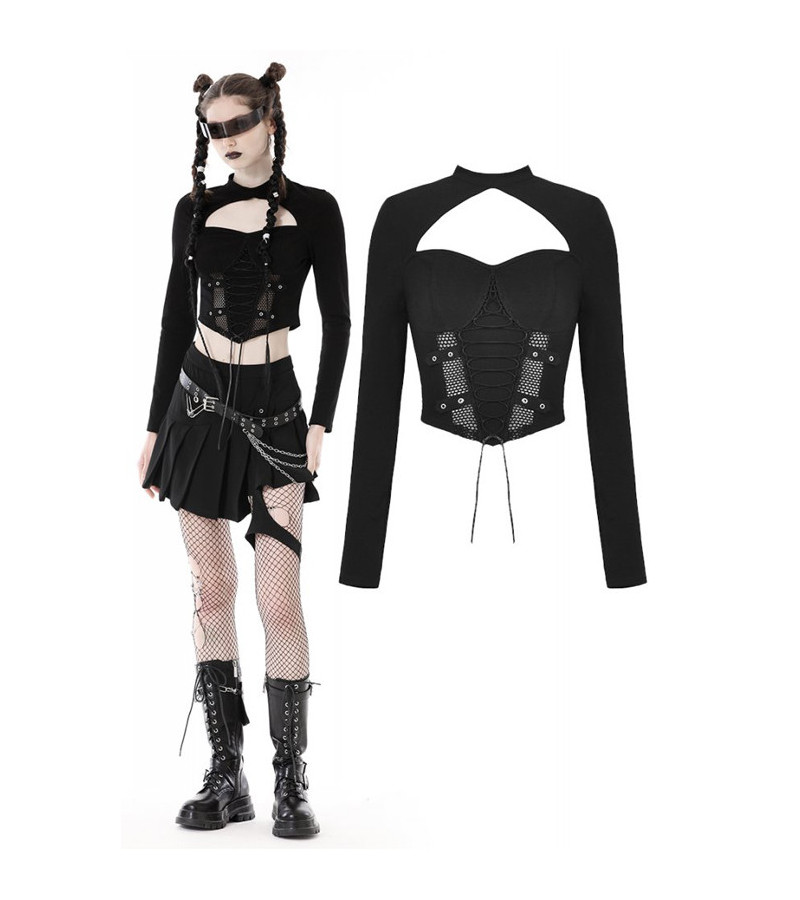 Long sleeves black fishnet top with straps, lacing and hollow outs.