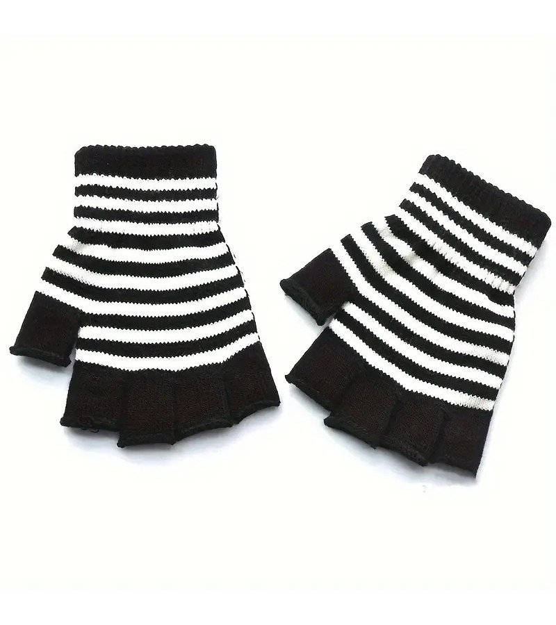 An must have for your grunge-punk look of the day. Our black and white small striped fingerless gloves are made in a stretch fabric, so they fit all.