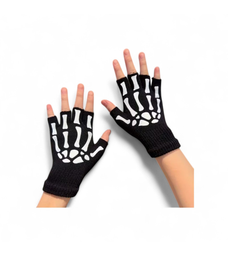 Pair of black with a white skeleton fingerless gloves. Unisexe. One size.