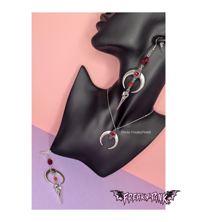 Gothic earrings with a crow skull, a half moon and red gems.