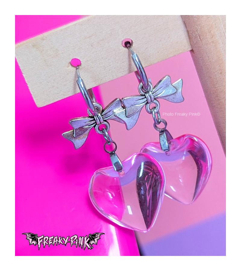 Pink transparent hearts with bows earrings. Kawaii earrings.