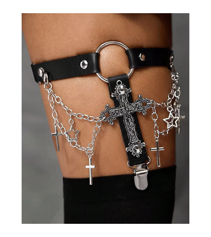 This gothic cross garter is made with black fake leather. It has chains with stars and crosses pendants.