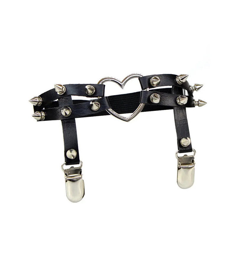 This black gothic heart garter is made with black fake leather. It features a silver colored heart and spikes. It has two attachments for high knee socks.