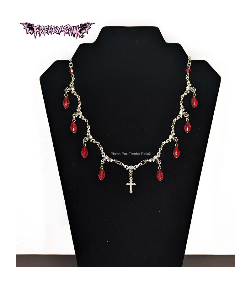 Gothic victorian vampire necklace with a small cross and red gems.