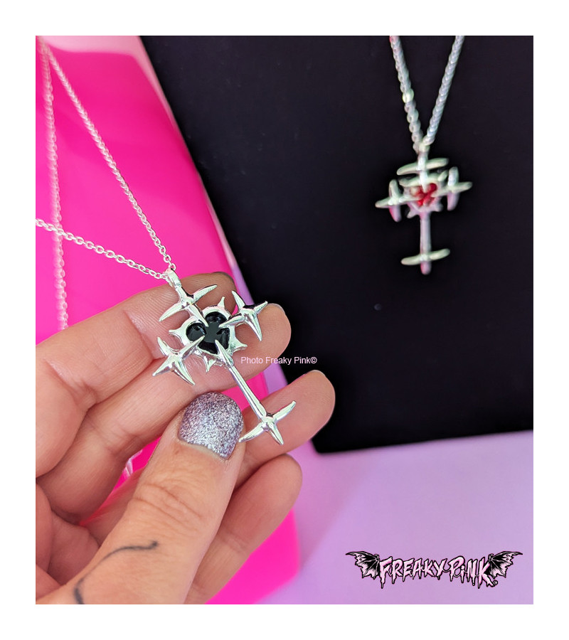 Y2K Harajuku Fashion style black gem necklace with spikes, in shape of a cross.