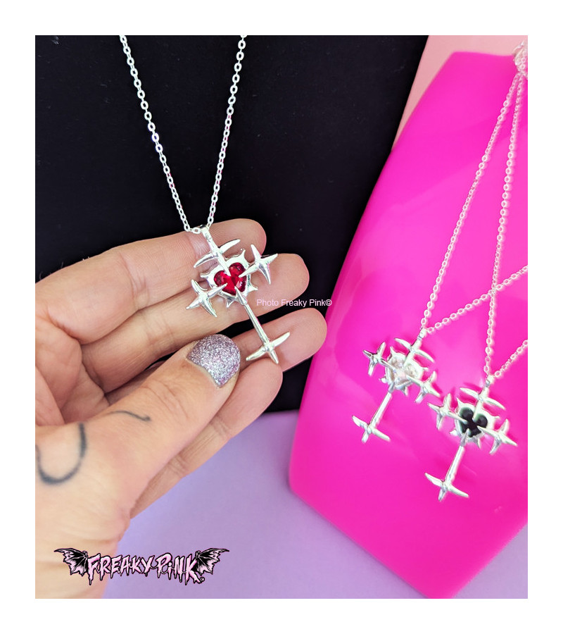 Y2K Harajuku Fashion style red gem necklace with spikes, in shape of a cross.