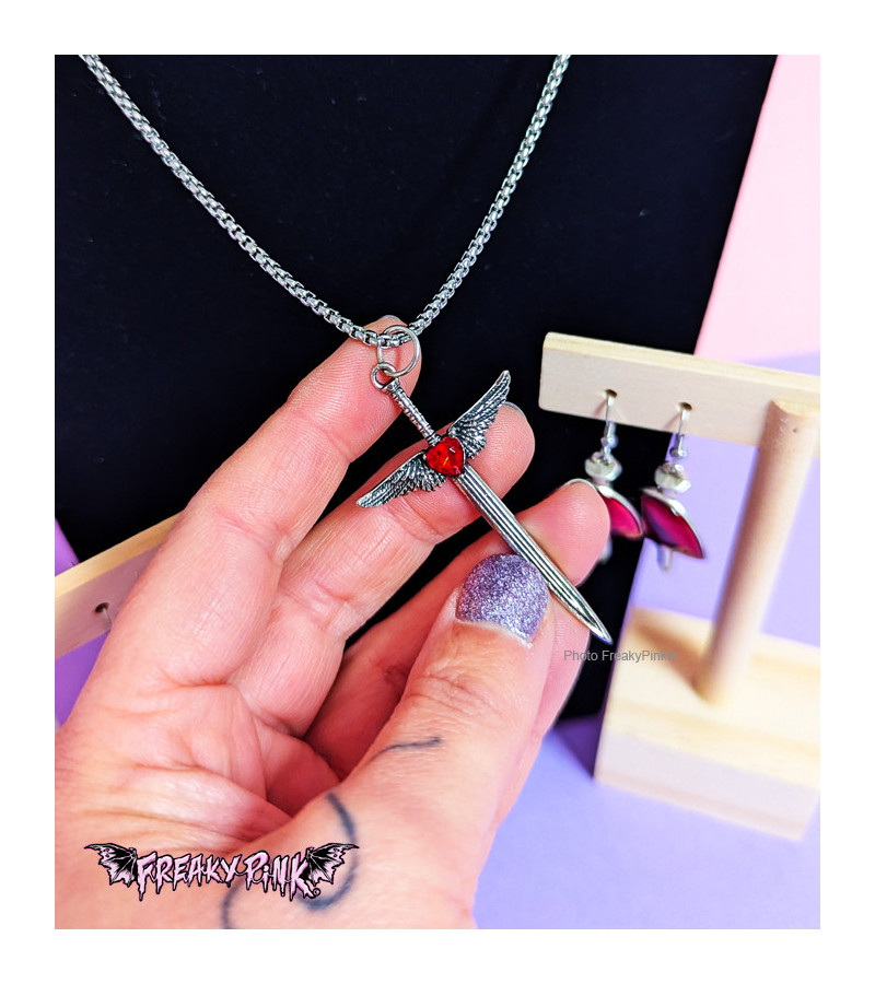 Gothic sword necklace with wings and a red heart gem in the middle.