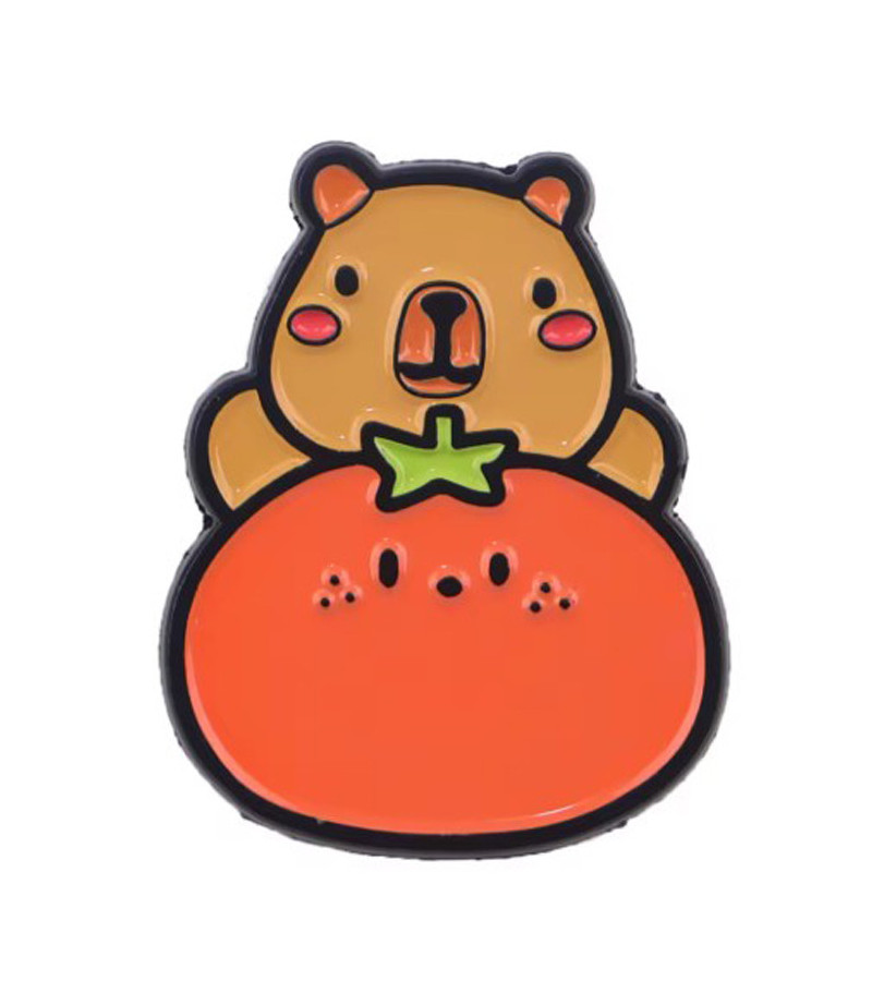 Cute capybara with tangerin pin. Black metal pin with black rubber fastening.