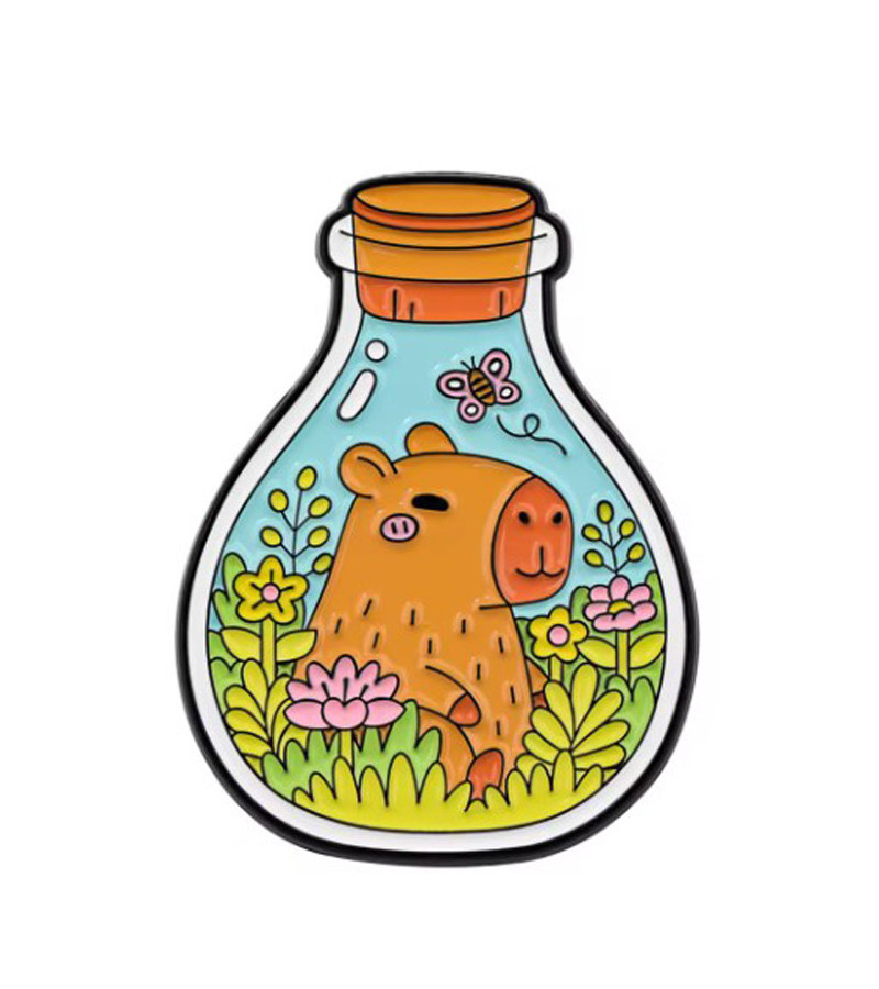 Cute capybara diorama pin. Black metal pin with black rubber fastening.