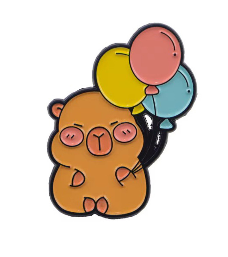 Cute capybara with balloons pin. Black metal pin with black rubber fastening.