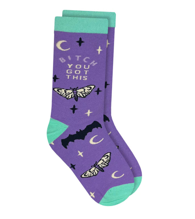 You "Bitch you got this" slogan, moth, stars and bats, purple socks.