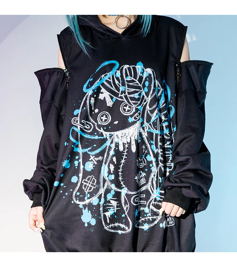It has lots of cool features like a bunny ears hood, shoulders zips with small crosses and a big front design of a sick blue rabbit.