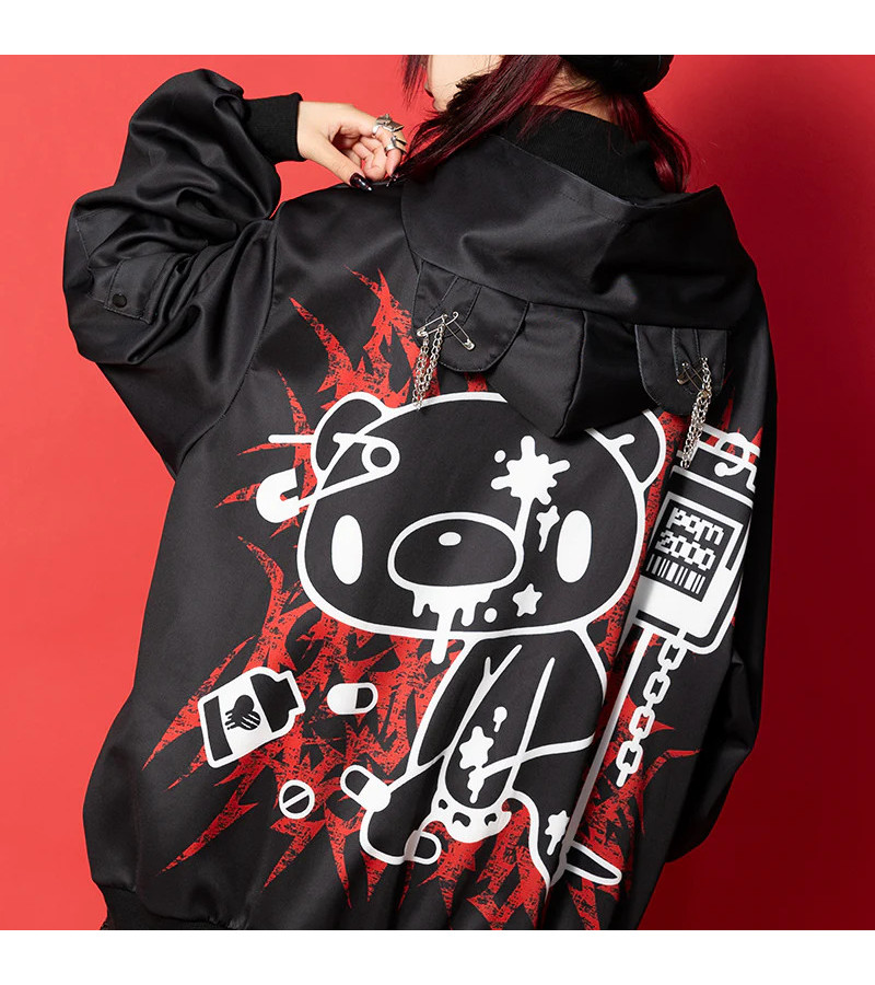 Straps. Pockets on sleeves with Gloomy embroidery. Bear ears on hood with punk safety pins.