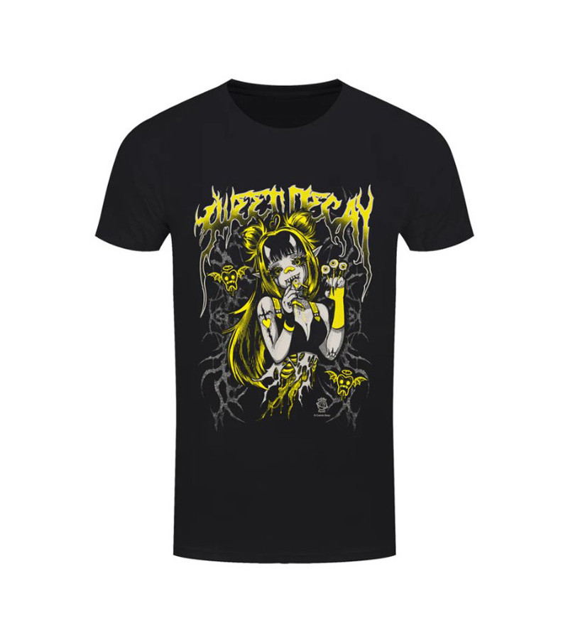The front design of a decaying girl is in yellow on a black cotton tee.