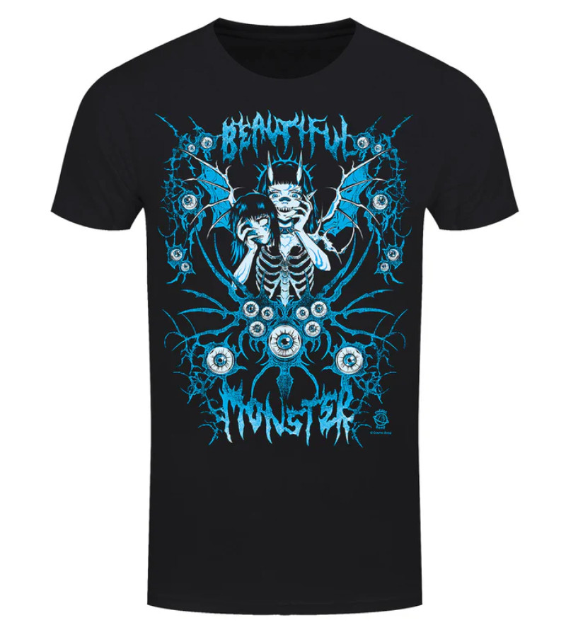 Black cotton tshirt with a big front design in blue of a succubus surroubded by eyes and the words Beautiful Monster.