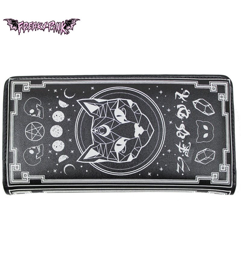 Get your awesome wallet from Banned. It features lots of cool occult symbols like pentagrams, cristals, skulls, moon phases and a cute cat.