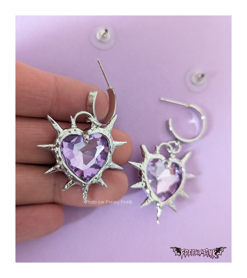On adore les grandes boucles d'oreilles en forme de cœurs, avec au centre un faux cristal violet, entourés de piques en métal argenté.