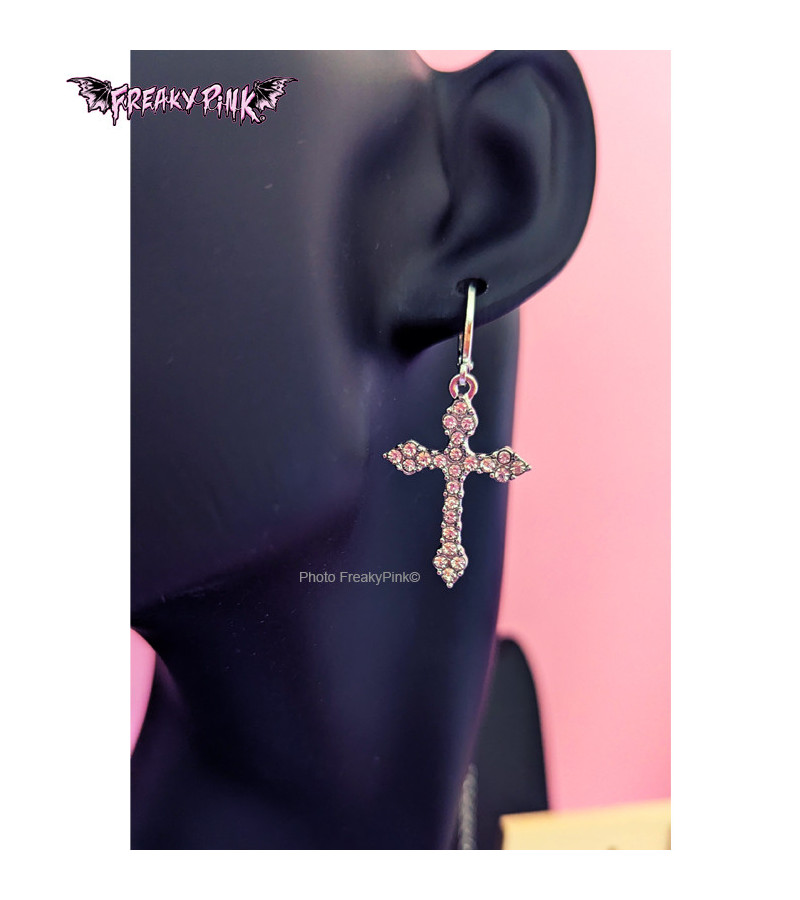 Boucles d'oreilles kawaii en forme de croix avec des strass.