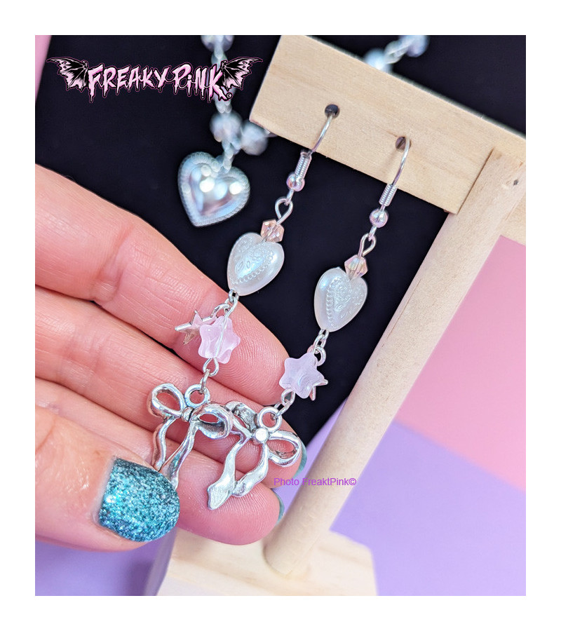 Boucles d'oreilles kawaii pendantes composées d'une perle cœur blanche, une perle étoile rose et un charme nœud argenté.