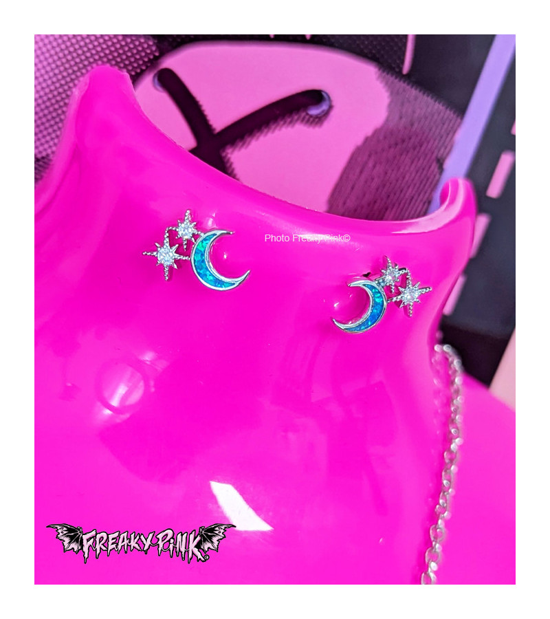 Boucles d'oreilles kawaii à clou, en forme de petites lunes bleues étoilées brillantes.