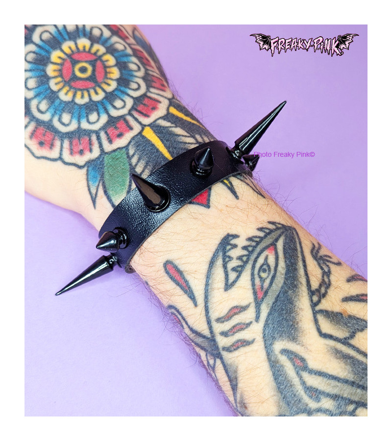 Bracelet gothique noir à piques longs et courts. Bracelet fait en simili cuir noir végane.