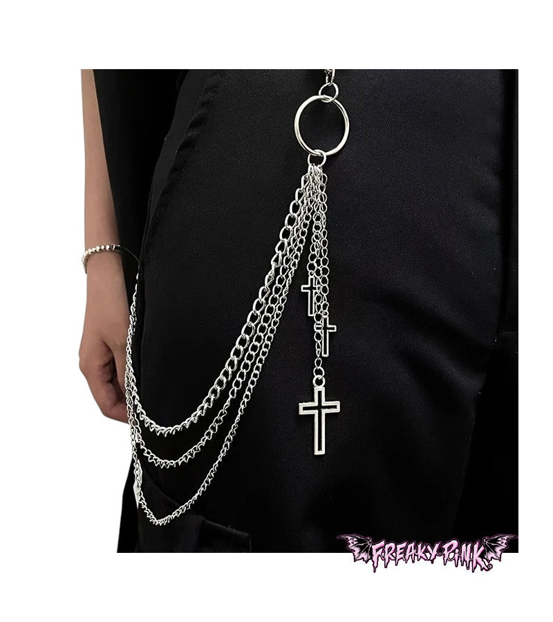 Chaine de pantalon de style gothique composée de 3 rangées et de pendentifs croix. Elle se ferme avec un mousqueton.