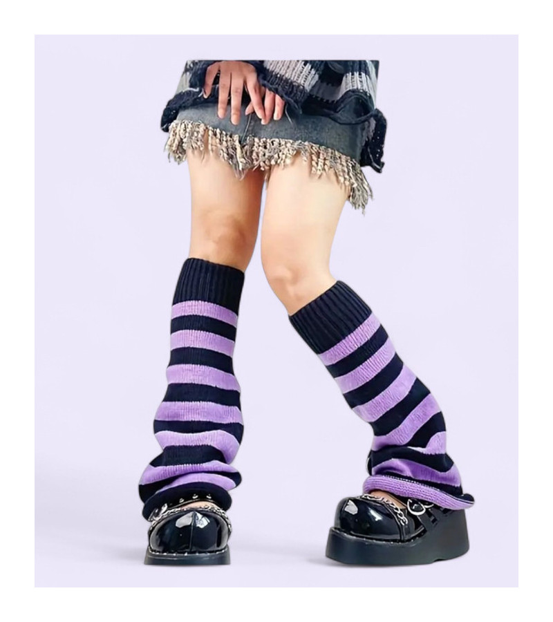 Leg warmers évasés à rayures noires et violettes.