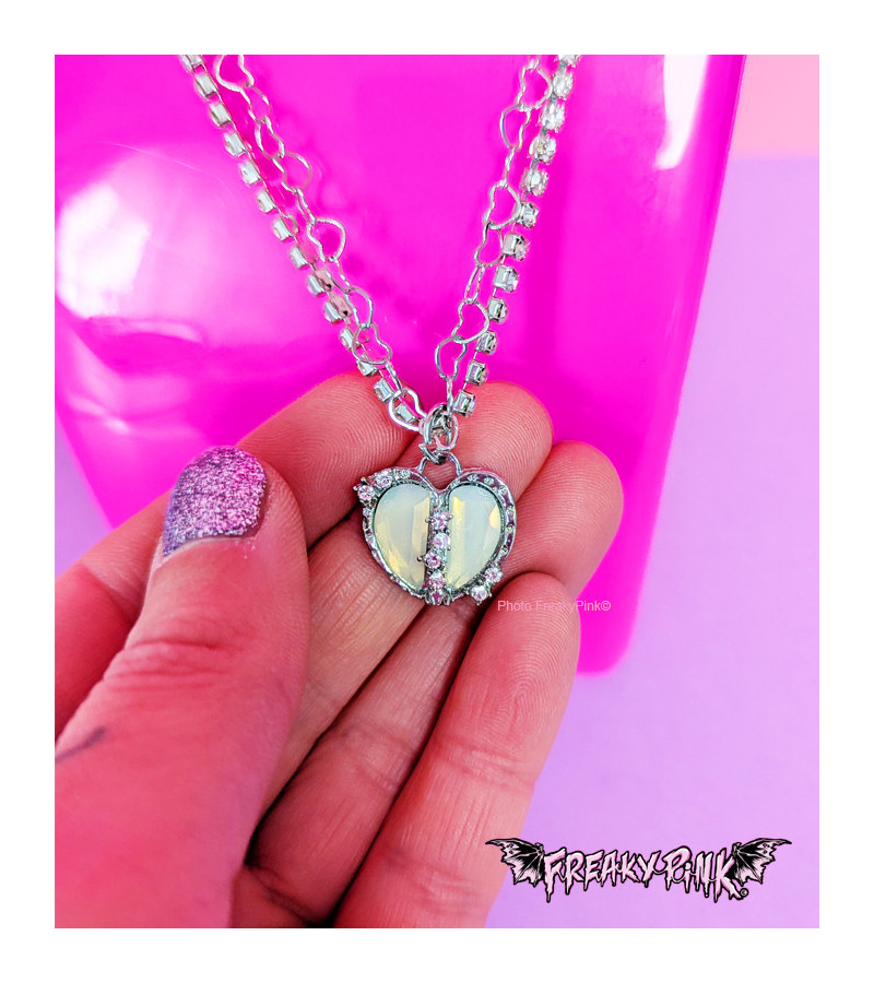 Collier cœur iridescent blanc, entouré de strass. Il possède une superbe double chaine.