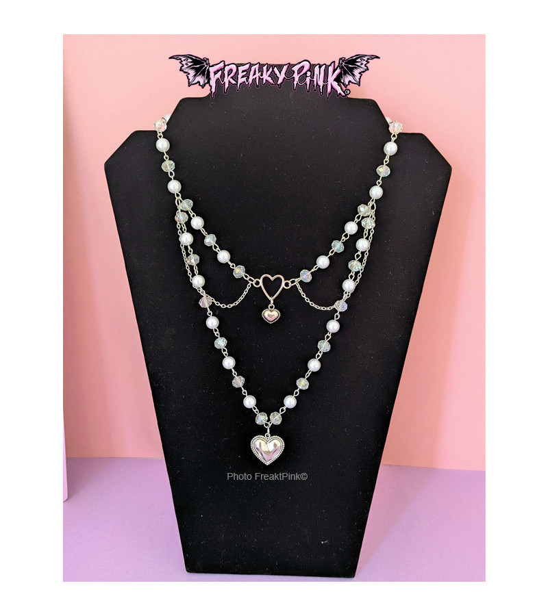 Collier kawaii cœurs avec des perles blanches. Grand collier à double rangée de perles.
