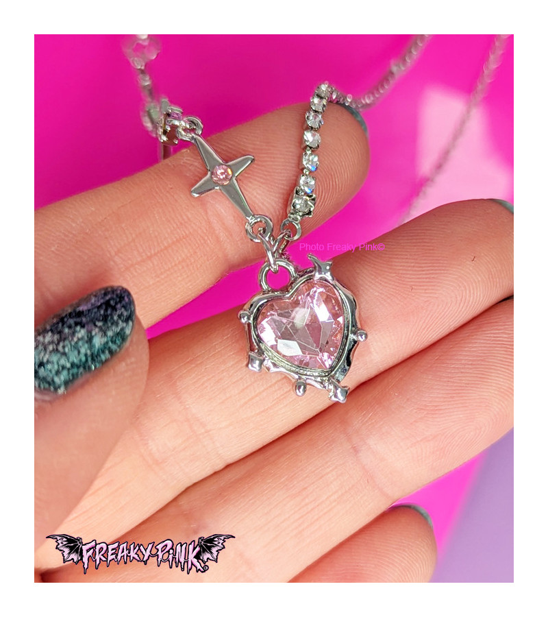 Collier cœur rose pastel de style kawaii, Y2K, très scintillant avec son pendentif en forme de cœur entouré d'étoiles.