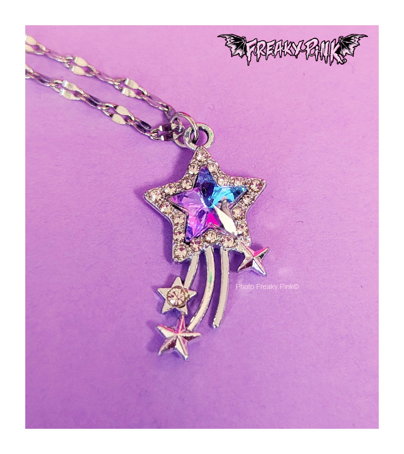 Collier kawaii avec un joli pendentif en forme d'étoile filante irisée dans les tons bleus, violets et roses. L'étoile est entourée de strass blancs.