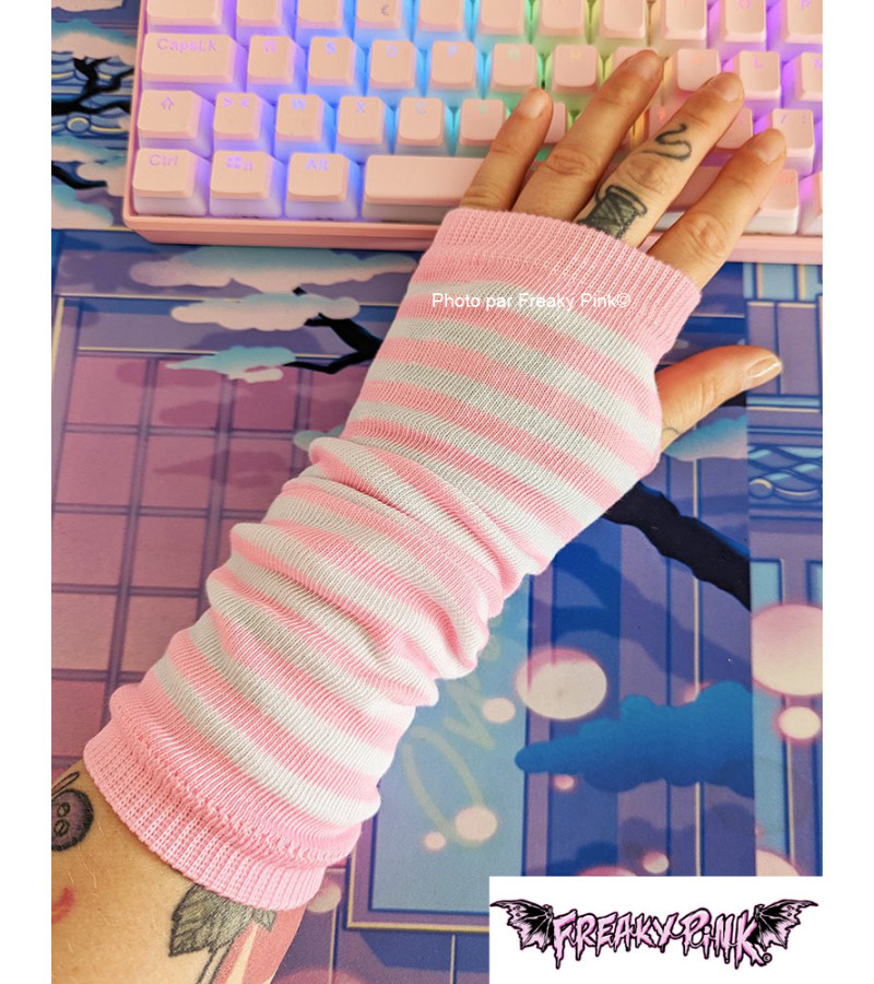 Accessoirise ta tenue kawaii ou de style Harajuku Fashion avec nos mitaines à rayures blanches et roses pastels. Elles sont faites dans un tissu stretch et sont donc de taille unique. Elles arrivent environ au coude et elles ont un trou pour passer les pouces.