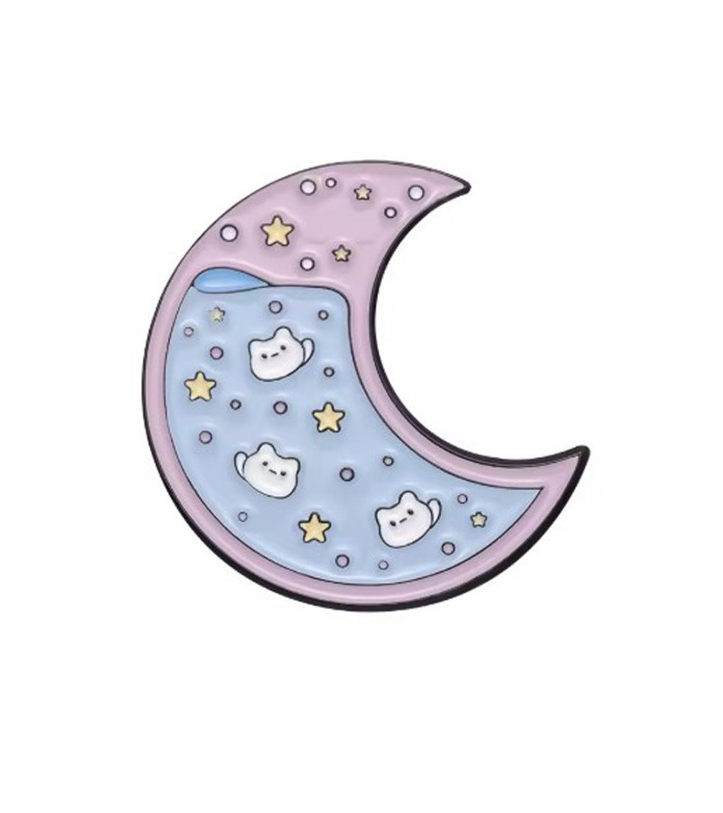 Pins lune kawaii pastel rose et bleue avec des étoiles et des chats.