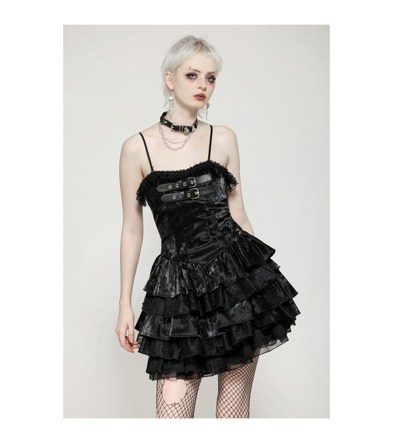 Bas de la robe à volants à dentelle noire en tissu PU effet brillant.