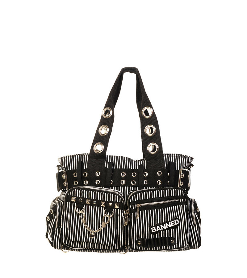 Grand sac à main rayé noir et blanc en tissu. Le sac a de nombreuses poches zippées à l'avant et sur les côtés, décorées de clous, de menottes, d'un crâne et d'une sangle à œillets.