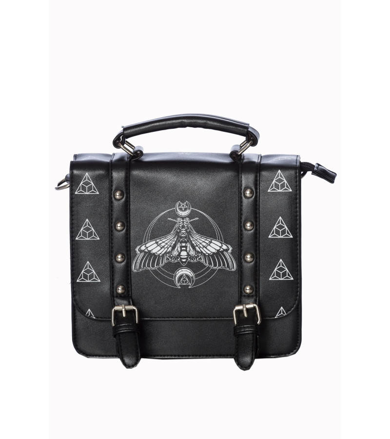 Petit sac cartable gothique noir aux motifs de papillons de nuit.