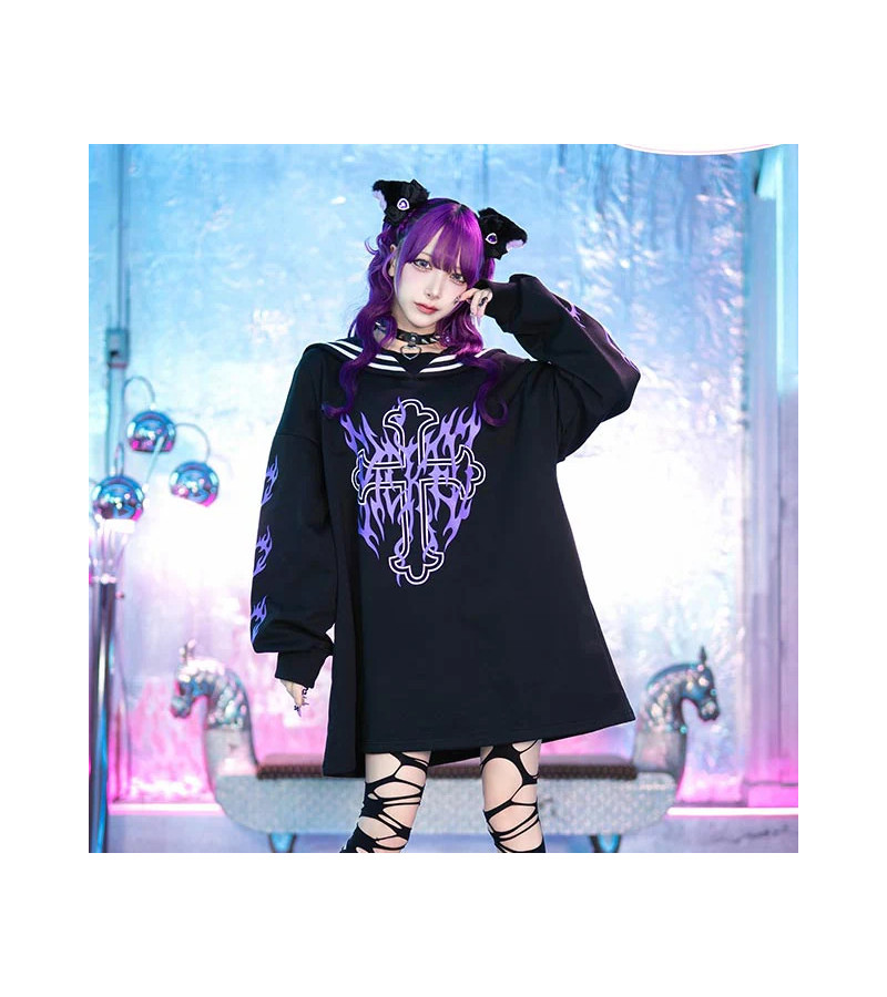 Sweat-shirt Sailor avec croix et flammes violettes de la marque japonaise d'Harajuku Listen Flavor.
