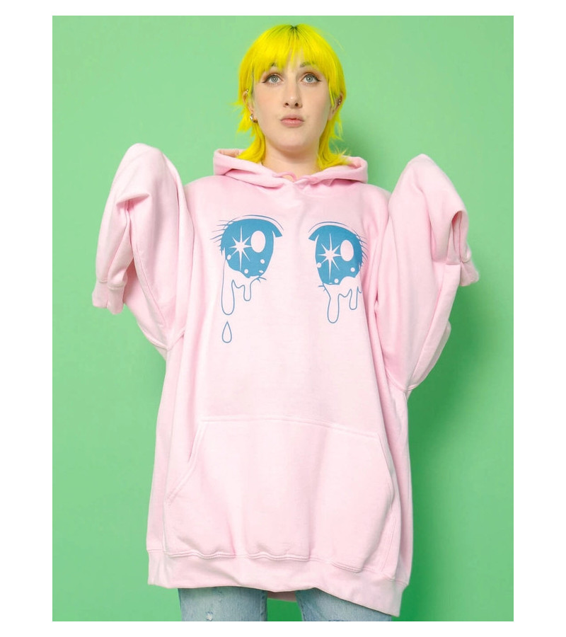 Sweat-shirt rose pastel à capuche avec un design de 2 yeux d'anime girl qui pleurent.