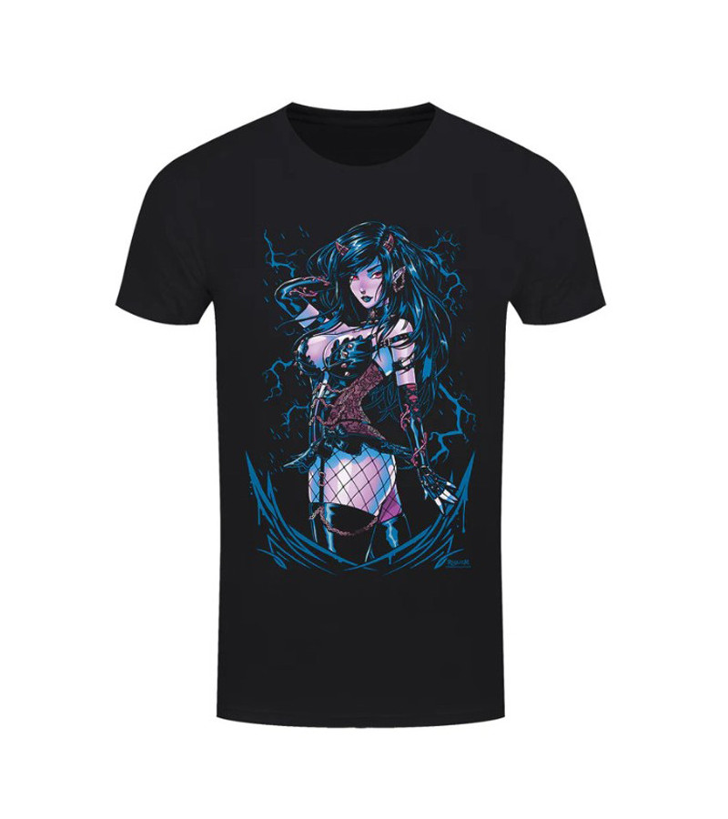 Grand design à l'avant du t-shirt de Mila, une démone sexy, bleue et rouge, habillée en sous-vêtements gothique.