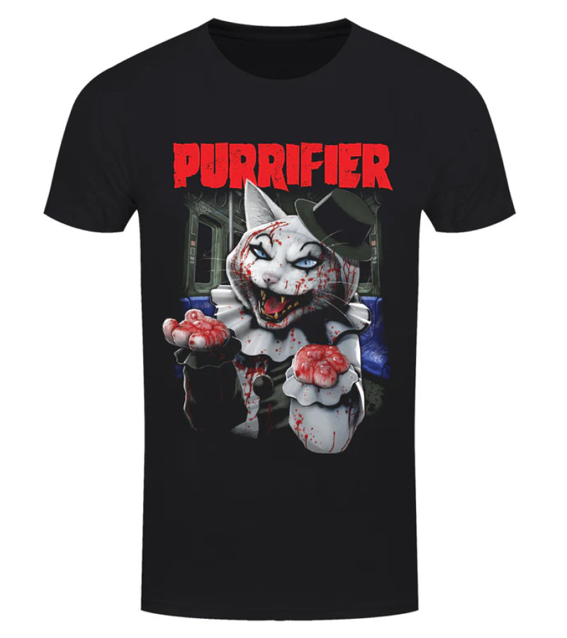 T-shirt Purrifier, parodie du film Terrifier, avec une grande impression à l'avant de Art le clown en chat.