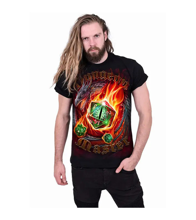 T-shirt gothique Dungeon Master avec un dragon, des dés et des flammes.