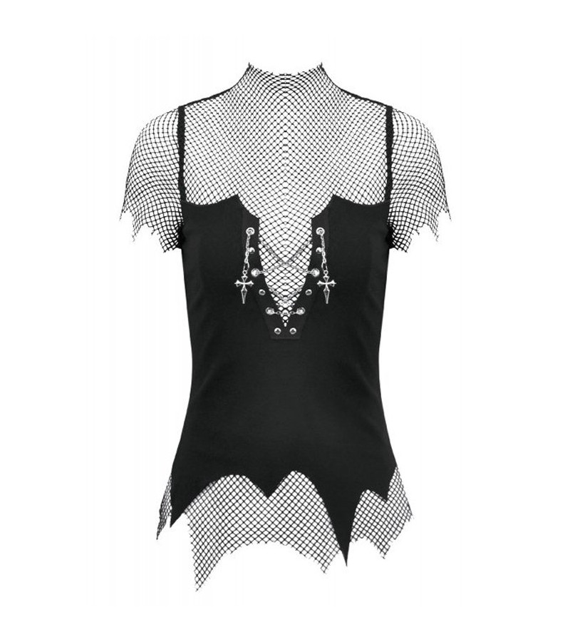 Top dark punk en coton et résilles noires, près du corps, avec des manches courtes et un laçage en chaines à l'avant.