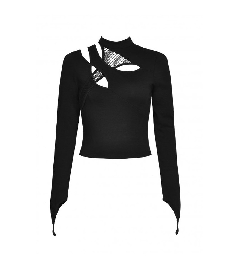 Top sexy noir, court, moulant, avec des manches longues, un col haut et des découpes.