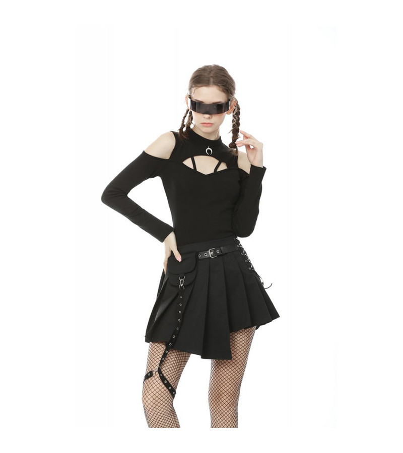 Top gothique noir, court, moulant, avec manches longues, des découpes et un croissant de lune décoratif.