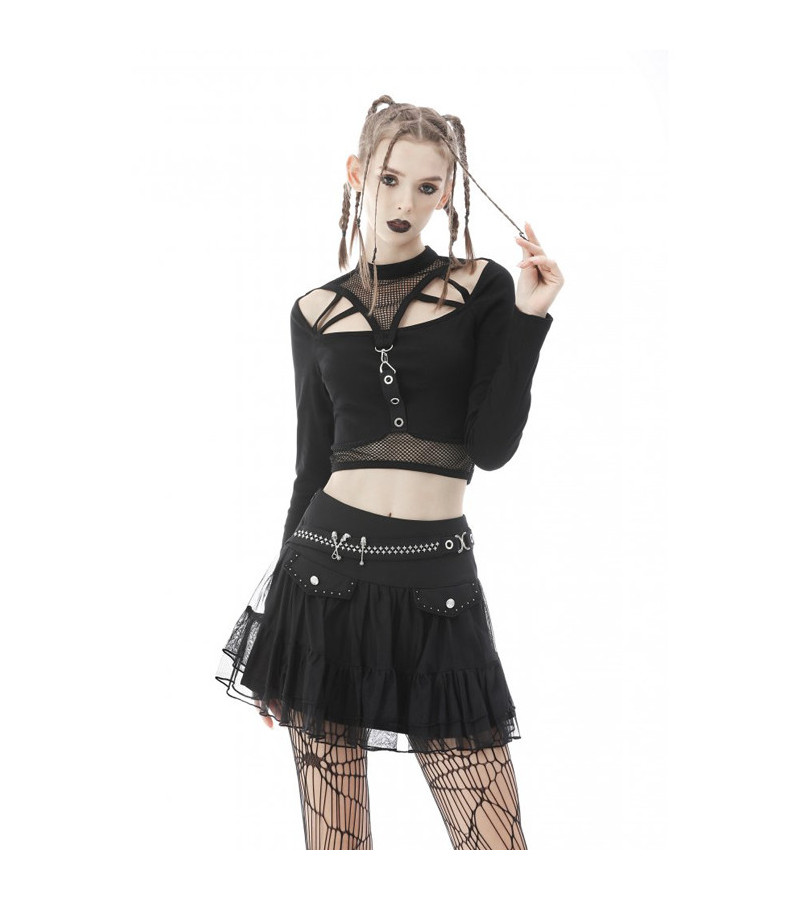 Top gothique noir, court, moulant, avec manches longues, des découpes et des sangles.