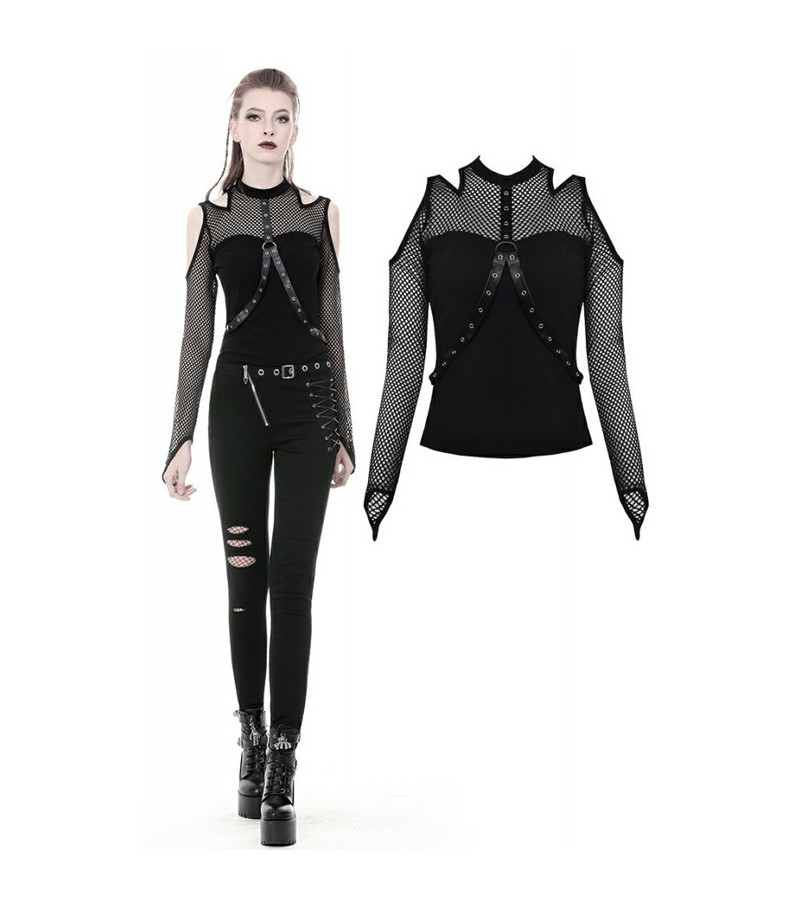 T-shirt punk rock à manches longues, en résilles noires, court, moulant, avec un col haut et des sangles.
